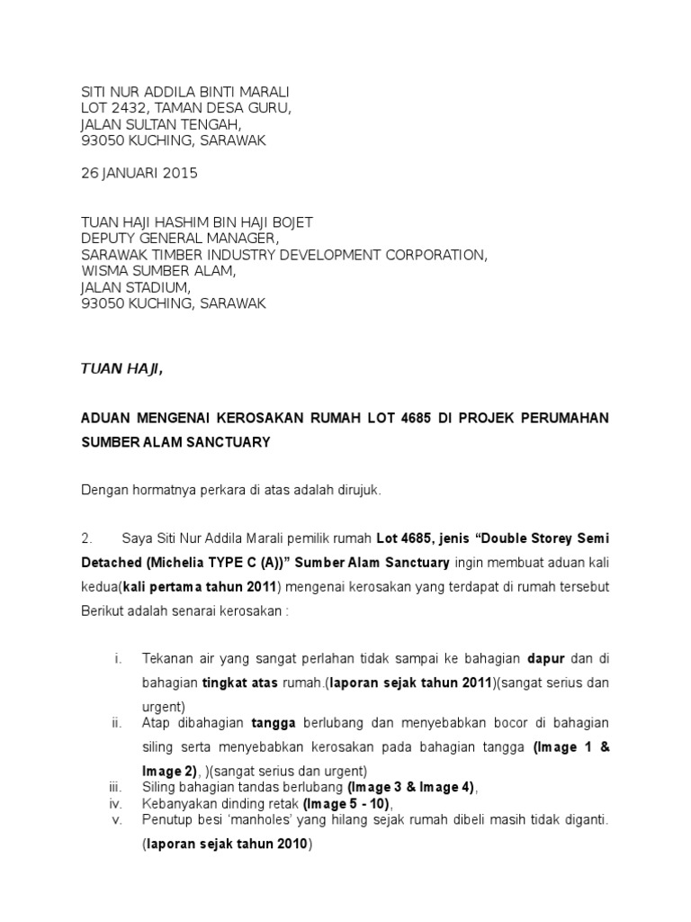Contoh Surat Aduan Kerosakan Rumah Kepada Pemaju Feerpons